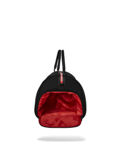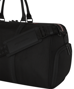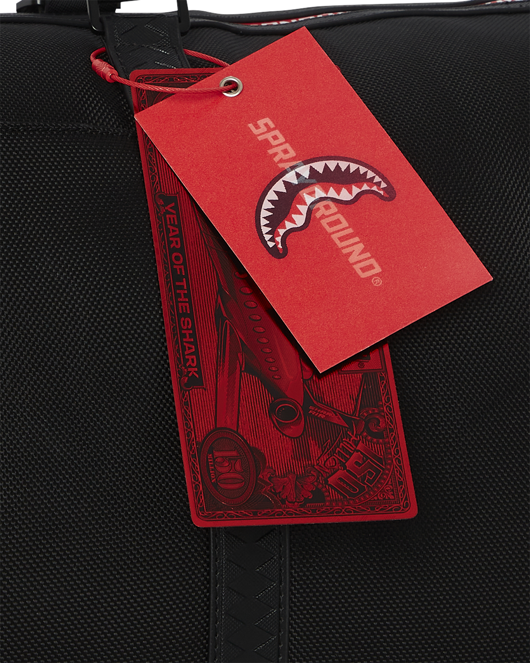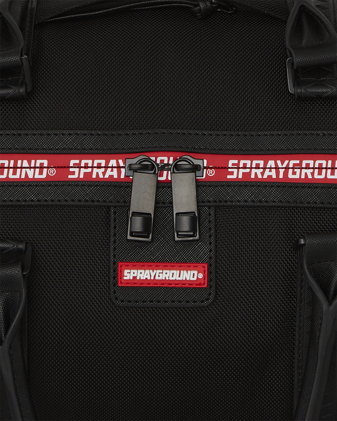 Ballistic polyester with SPRAYGROUND printed zipper tape and a rubber sharkmouth.